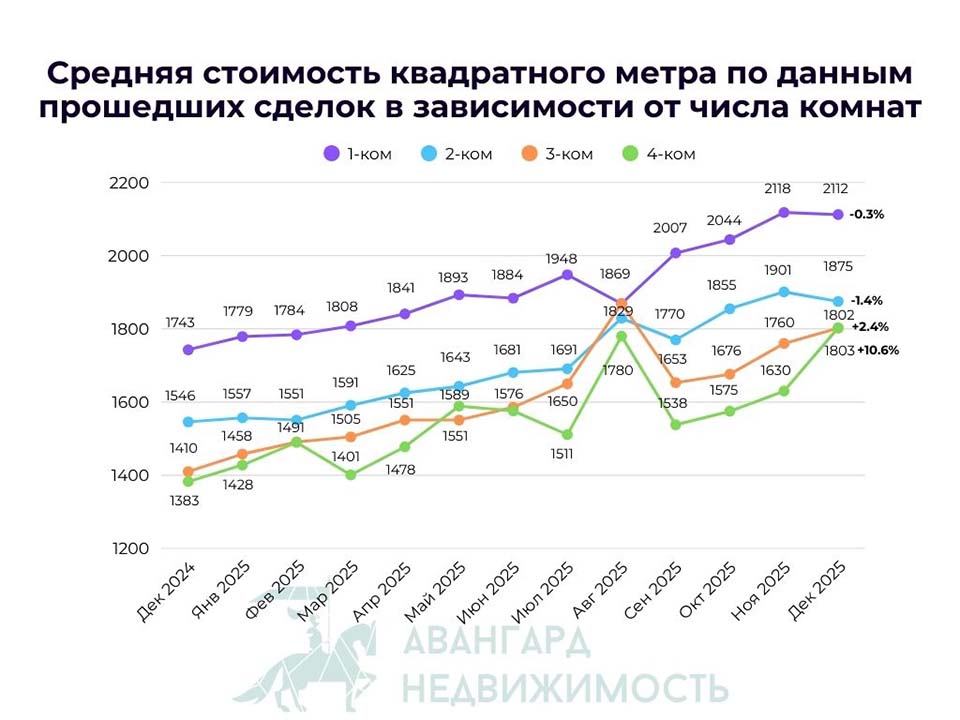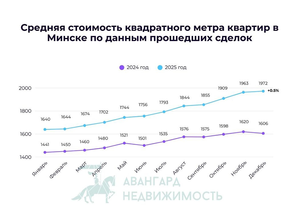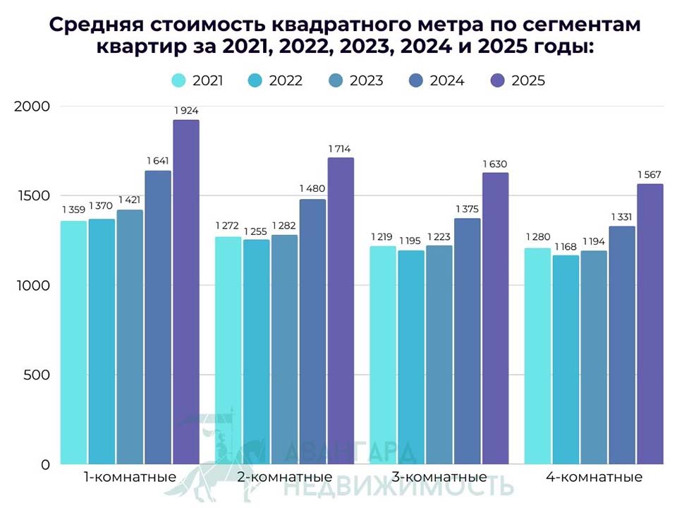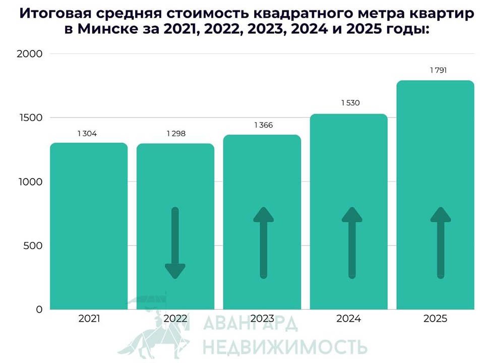 За год средняя стоимость квадратного метра увеличилась на 17%. Напомним, что средняя цена квадратного метра за год в 2024 году - 1 530$/м2. А вот в 2025 квадрат в среднем стал стоить - 1 791$.