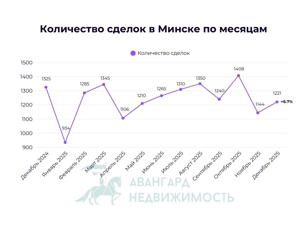 После небольшого падения количества сделок в ноябре, декабрь показал более привычное значение в 1 200+ сделок. На дату подготовки статьи в Минске прошла 1 221 сделка с недвижимостью по итогам декабря. Это на 6.7% больше, чем в ноябре. О других итогах на рынке недвижимости Минска в нашем традиционном аналитическом обзоре.