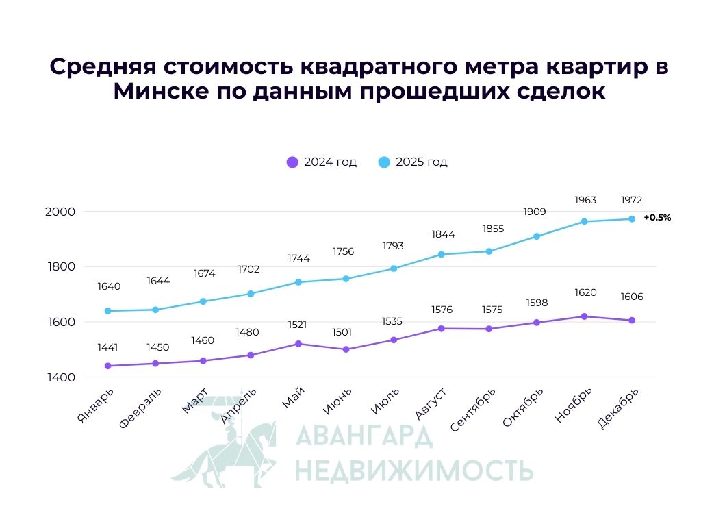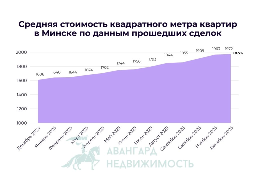 Эквивалент долларов США по курсу НацбанкаРост средней цены квадратного метра жилья в Минске по-прежнему не останавливается. Новый месяц и еще +9$ к показателю ноября. В процентном отношении это еще +0.5% и итоговые 1972$/м2 в декабре. Пока цена не достигла ожидаемых 2 000$ за метр квадратный. Посмотрим, может 2026 год сделает эту цифру реальностью. За год средняя цена выросла на внушительных 366$ или +22.8%.