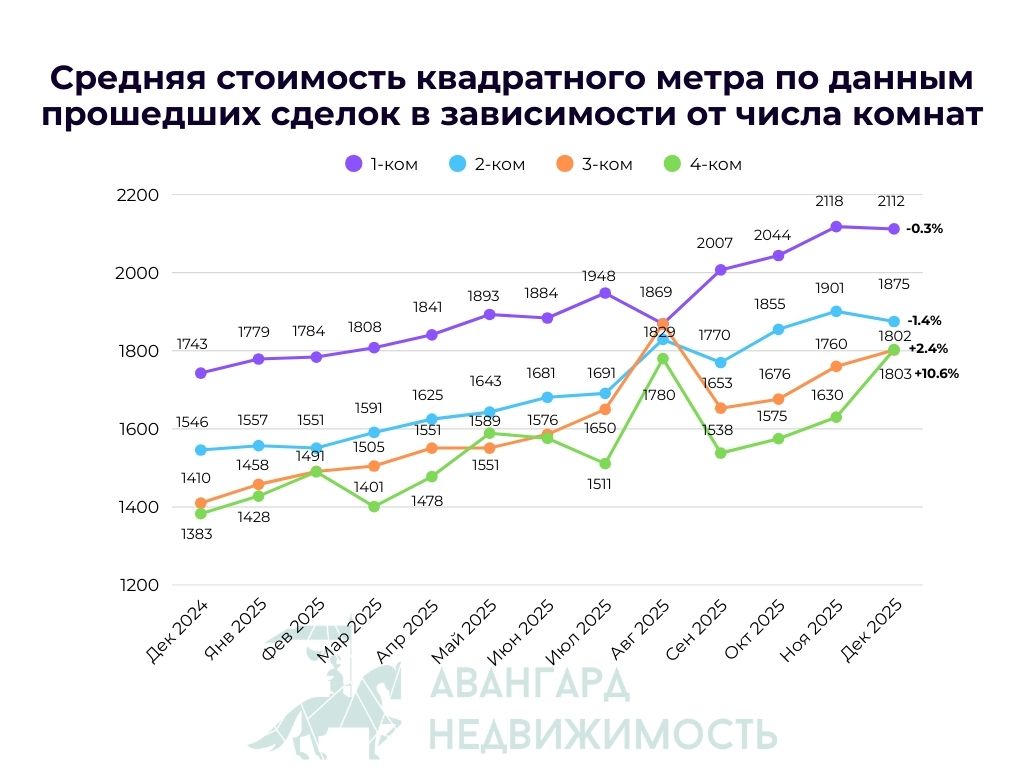 А вот сегменты 3-комнатных и 4-комнатных квартир, наоборот, в декабре подросли. +2.4% для 3-комнатных квартир и существенных +10.6% для 4-комнатных. Итоговые значения в декабре - 1 802$/м2 и 1 803$/м2 соответственно.