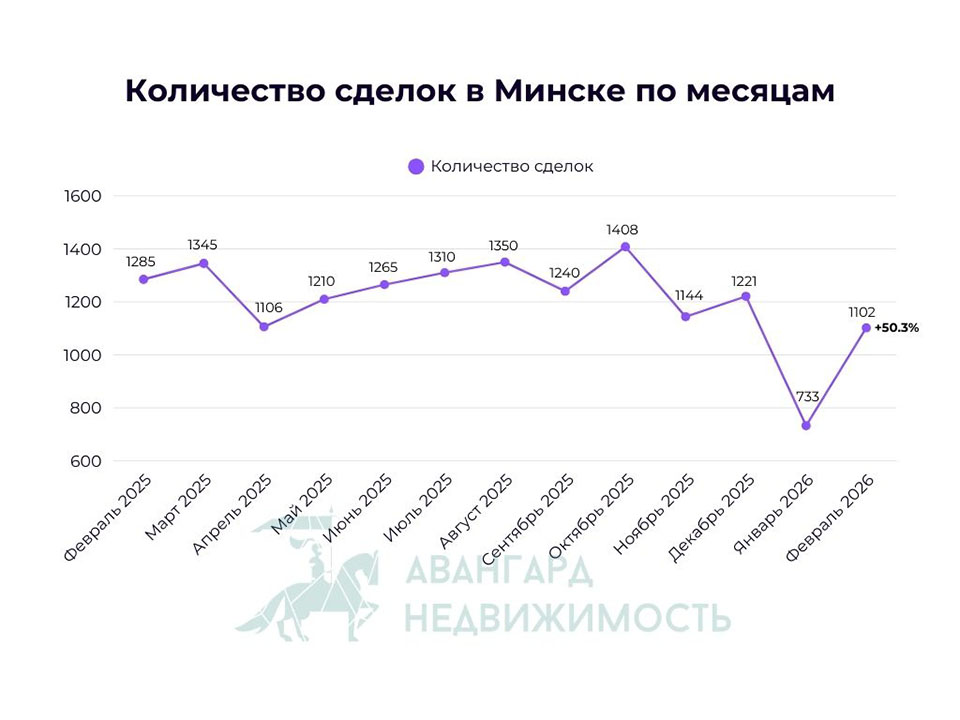 В феврале 2026 года в Минске прошло 1 102 сделки с квартирами. По сравнению с январем количество сделок увеличилось аж на 50.3%. Для сравнения в феврале прошлого года прошло 1 285 сделок. То есть в этом году в феврале прошло на 14.2% меньше сделок, чем в прошлом.