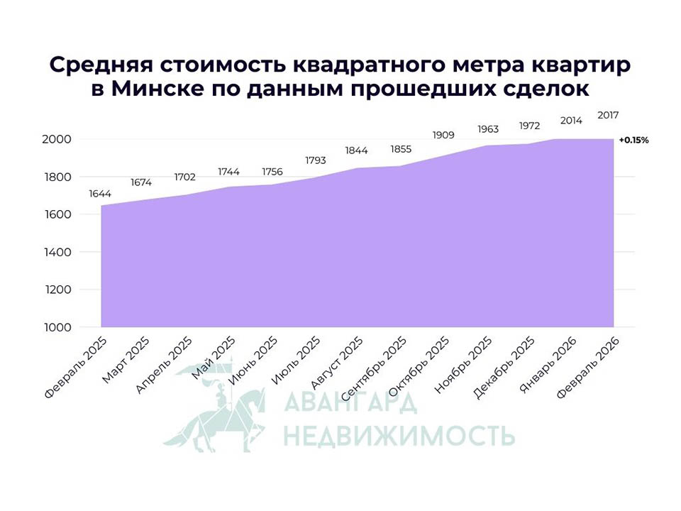 В феврале один квадратный метр жилья в столице в среднем стоил 2 017$. Это еще +0.15% к показателю января. А если сравнить этот показатель с февралем прошлого года (1 644$/м2), то рост +373$ или 22.7%. Рост цен в Минске по-прежнему не останавливается, хоть уже и не такой стремительный, как был ранее.