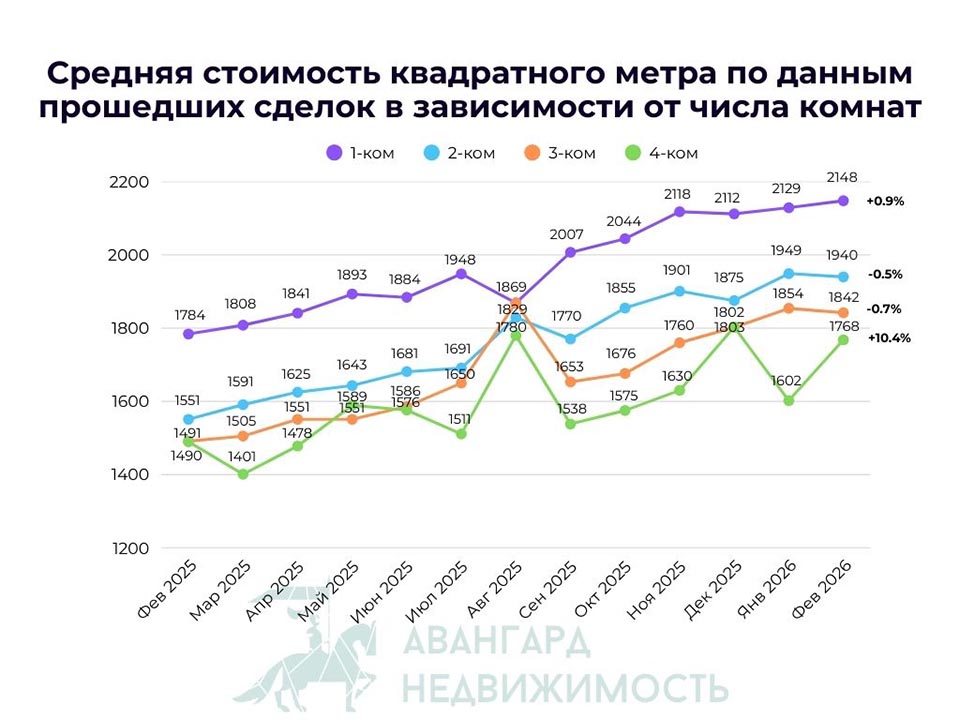 Средняя стоимость квадратного метра в сегменте 1-комнатных квартир по-прежнему растет. В феврале 2026 г. очередное обновление рекорда - 2 148$/м2. Это еще +0.9% к показателю января.