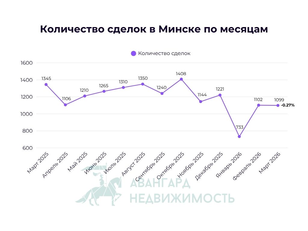 На дату подготовки статьи в марте прошло 1 099 сделок с недвижимостью в Минске. Это на -0.27% меньше, чем в феврале текущего года. Напомним, что в марте прошлого года прошло 1 345 сделок. А это на 18.3% больше, чем сейчас. О рекордах марта и других показателях рынка недвижимости столицы рассказываем в новой статье рубрики “Аналитика”.