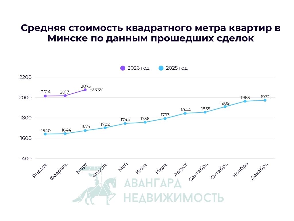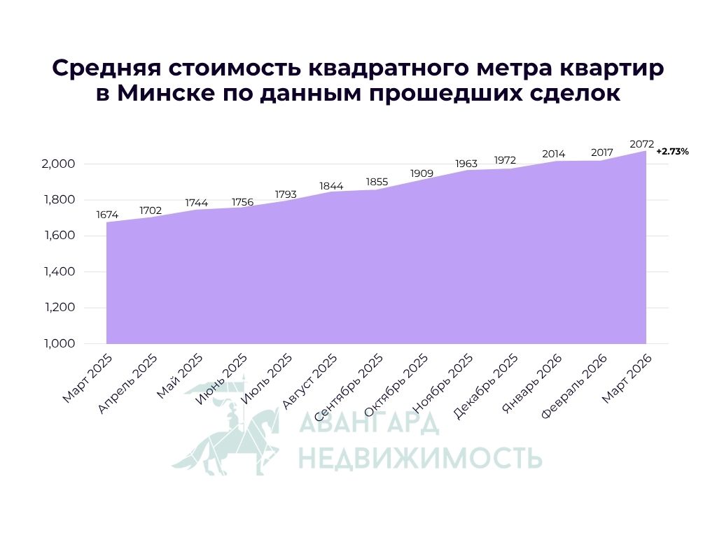 По итогам марта один квадратный метр жилья в столице в среднем стоит 2 072$. Это еще +2.73% к показателю февраля. По сравнению с мартом 2025 года цена выросла на существенные 23.8% или 398$.