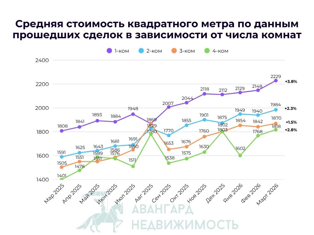Средняя стоимость квадратного метра в сегменте 1-комнатных квартир прибавила больше всех. После обновления очередного рекорда цены в феврале 2026 г., уже в марте рекорд вновь обновлен - 2 229$/м2. За месяц средняя стоимость в сегменте однушек прибавила 81$. Или еще +3.8% к показателю февраля.