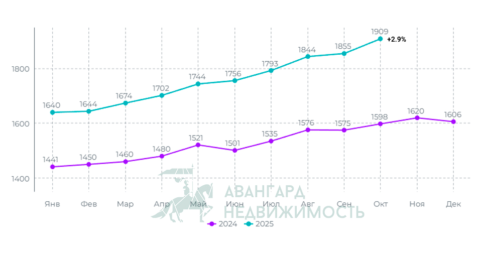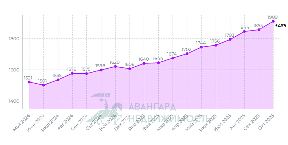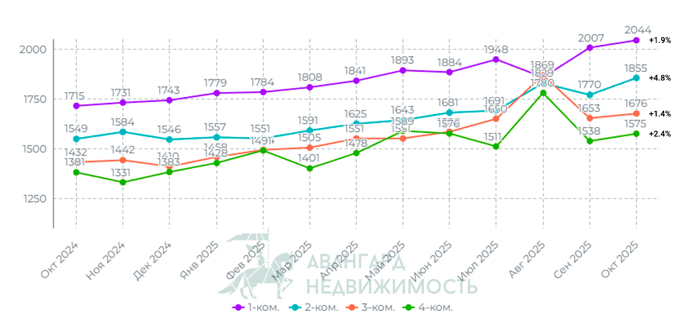 2-комнатные квартиры подросли в цене заметнее остальных (+4.8% к показателю сентября). Цена квадратного метра в октябре составила 1 855$.