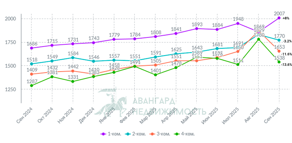 На смену рекордным показателям августа пришел более спокойный сентябрь. Во всех сегментах квартир за исключением 1-комнатных произошло снижение средней цены.
