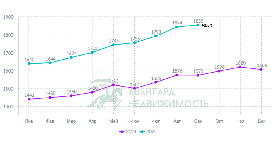 В сегменте 3-комнатных квартир средняя цена квадрата зафиксирована на 1 653$ за метр квадратный. По сравнению с сентябрем прошлого года в абсолютных значениях цена выросла на 244$ или +17.3%.