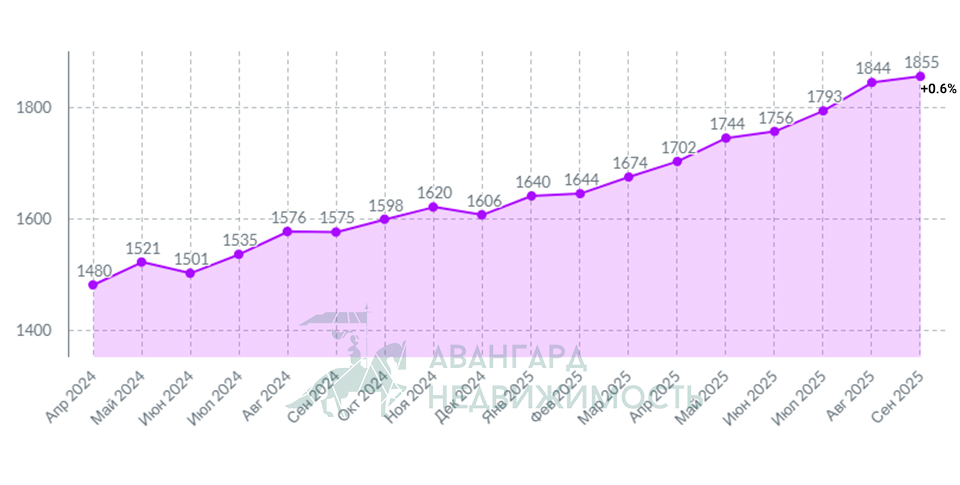 Сегмент 4-комнатных по-прежнему самый нестабильный. И вновь резкий рост сменился сильным падением цены. В сентябре квадратный метр стоил 1538$. Это на 13.6% меньше, чем в августе. В сравнении с сентябрем 2024 года цена квадрата в сегменте 4-комнатных квартир выросла на 251$ или +16.3%.