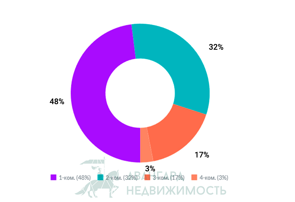В сентябре ситуация в статистике по прошедшим сделкам в зависимости от количеств комнат снова вернулась в привычное русло. Как всегда больше всего сделок прошло с 1-комнатными квартирами - 48%.