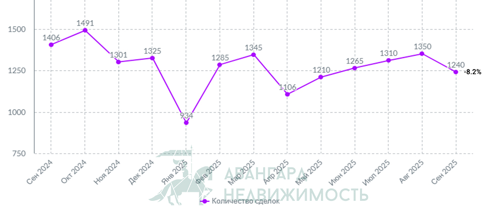 На дату подготовки статьи в сентябре в Минске прошло 1 240 сделок с недвижимостью. Это на 8.2% меньше, чем в августе 2025 г. (1 350 сделок). Напомним, что в августе прошло максимальное количество сделок в этом году. Если сравнивать с сентябрем прошлого года, то сделок прошло меньше на 11.8%.